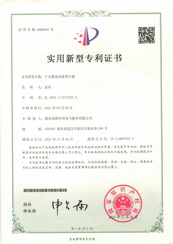 我公司擁有自主研發(fā)的多項(xiàng)專(zhuān)利技術(shù)。其中電氣試驗(yàn)設(shè)備類(lèi)專(zhuān)利四項(xiàng),變壓器類(lèi)制造專(zhuān)利三項(xiàng),調(diào)壓器制造專(zhuān)利兩項(xiàng),電阻柜專(zhuān)利一項(xiàng),以此為核心技術(shù)開(kāi)發(fā)出多種新產(chǎn)品。