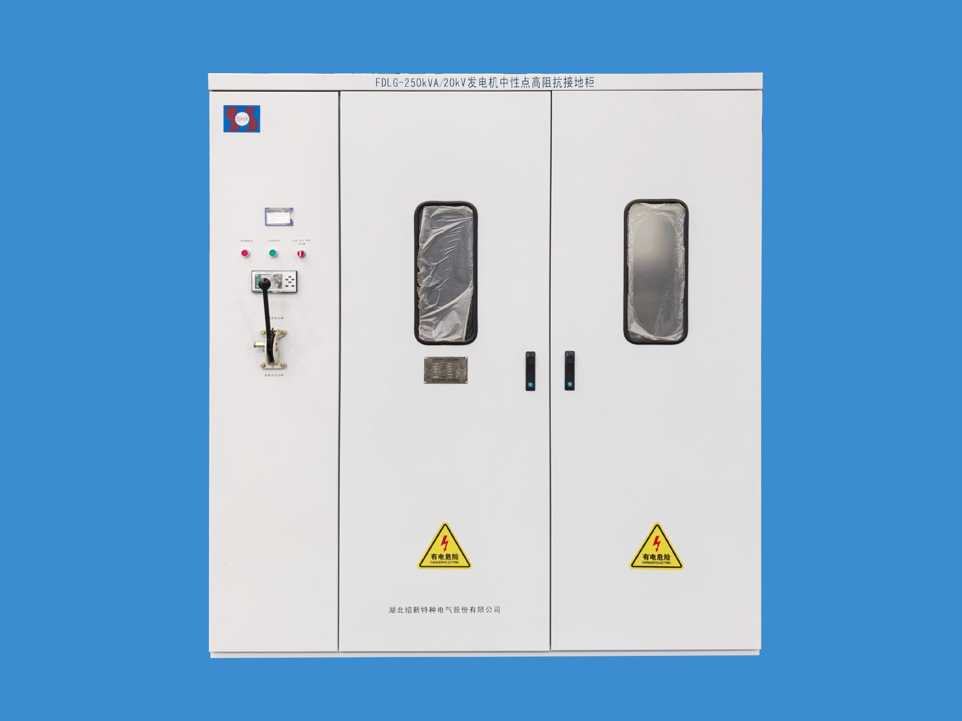 由表1可知,在五種發(fā)電機(jī)中性點(diǎn)接方式中,以高電阻接地方式性能******。所謂高電阻接地方式,如圖1所示:即在發(fā)電機(jī)中性點(diǎn)上接一配電變壓器,變壓器的低壓線圈接一低阻值電阻,該電阻通過(guò)配電變壓器轉(zhuǎn)換到高壓側(cè)時(shí),阻值升高至變比的平方倍,從而構(gòu)成高電阻接地方式,以達(dá)到既限制了發(fā)電機(jī)單相接地故障時(shí)電流值,同時(shí)又限制了接地電弧引起的過(guò)電壓值的目的。由于電阻在接地故障中的引入,使電流、電壓、鐵磁等各種諧振現(xiàn)象將受到阻力而限制到最低,這樣就防止了各種諧振過(guò)電壓的出現(xiàn)?;谏鲜鲈?,發(fā)電機(jī)中性點(diǎn)經(jīng)配電變壓器接地的高阻接地方式成為當(dāng)前國(guó)際最廣泛采用的一種發(fā)電機(jī)中性點(diǎn)接地方式,本接地變壓器柜,即是為實(shí)現(xiàn)發(fā)電機(jī)中性點(diǎn)高電阻接地方式而專門設(shè)計(jì)的。